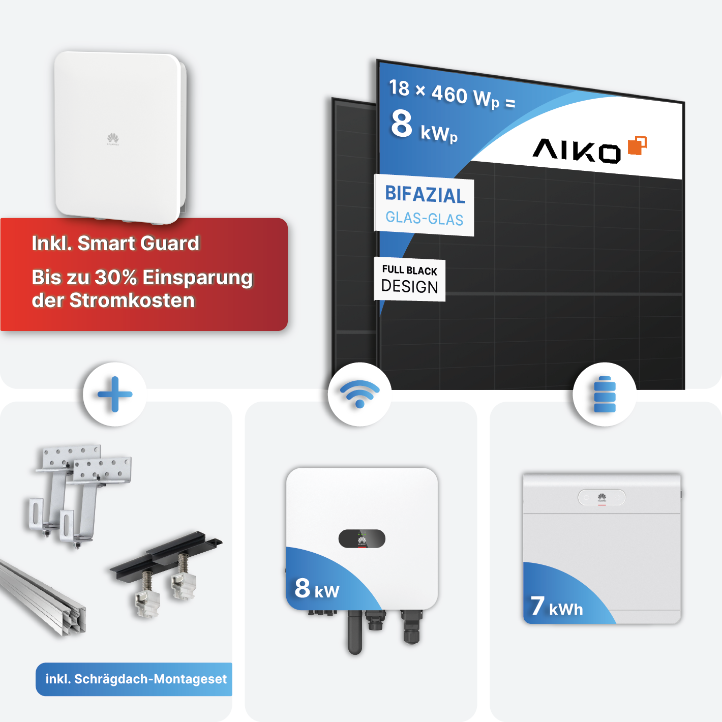 8 kWp PV Komplettanlage mit Huawei Hybridtechnik und AIKO Glas-Glas-Modulen